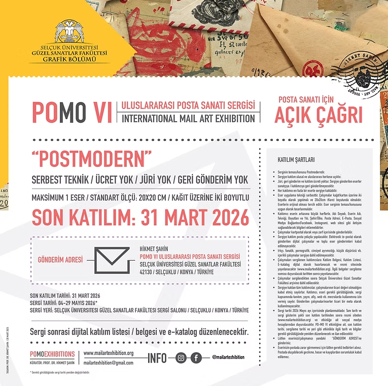 Konya Selçuk Üniversitesi Güzel Sanatlar Fakültesi tarafından düzenlenen "POMO VI Uluslararası Posta Sanatı Sergisi"nde fakültemiz Resim Bölümü öğrencilerinden Behicenur Burhan, Cemile Hasar, Esin Aksan, Fatma Kömbeci, Mukaddes Gül Demir, Nagehan Büşra Gökmen, Ömer Faruk Şen, Selahaddin Ürük, Selin Burcu Erol, Sema İnce, Sevilay Toprak, Sultan Pehlevan, Şeyda Dağgülü, Ümmühan Aykut ve Zehra Elif Koca isimli öğrencilerimiz sergileme almıştır.