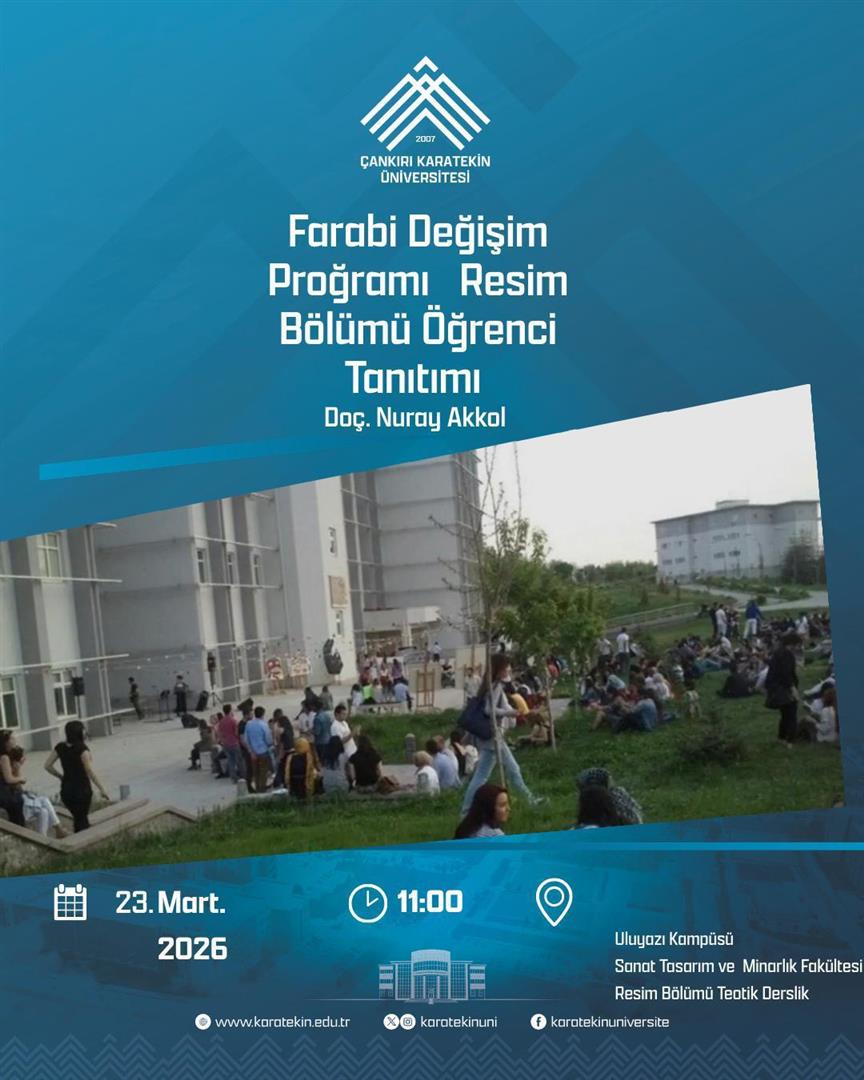 Farabi Değişim Programı Resim Bölümü Öğrenci Tanıtımı Etkinliği Do. Nuray Akkol tarafından 23 Mart 2026 tarihinde saat 11:00`da Uluyazı Kampüsü Sanat, Tasarım ve Mimarlık Fakültesi, Resim Bölümü teorik dersliğinde gerçekleştirilmiştir.